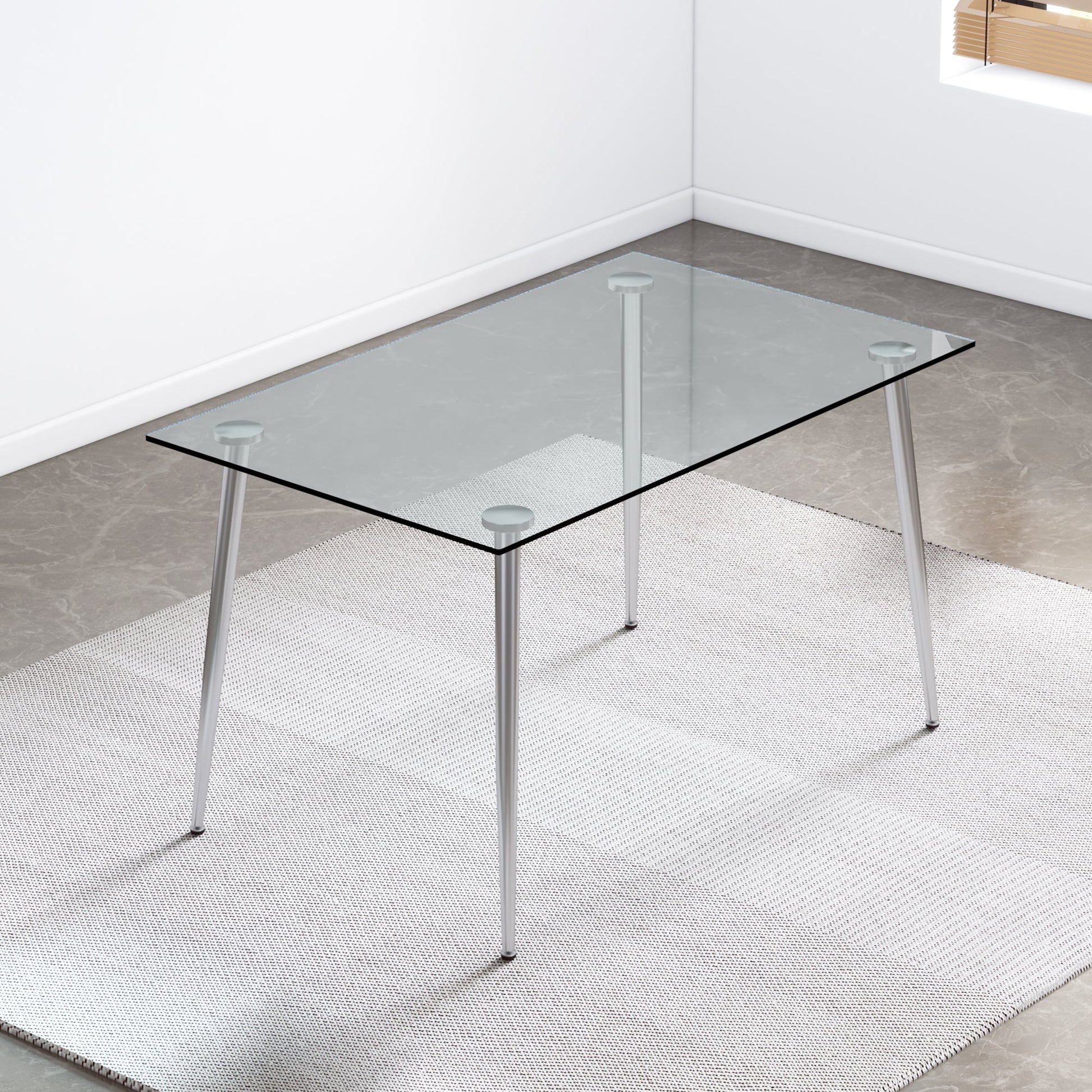Add a touch of sophistication to your dining space with the EverCart™ Modern Minimalist Rectangular Glass Dining Table. Featuring a 0.31" thick tempered glass top and silver-plated metal legs, this table combines clean design with everyday durability.
